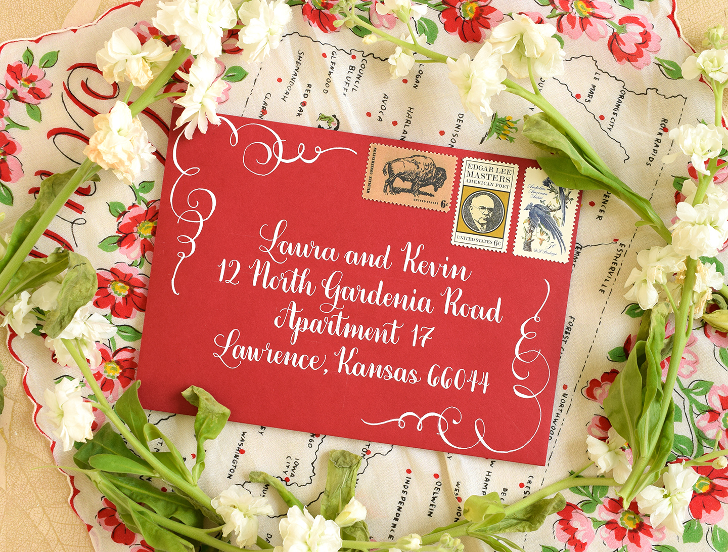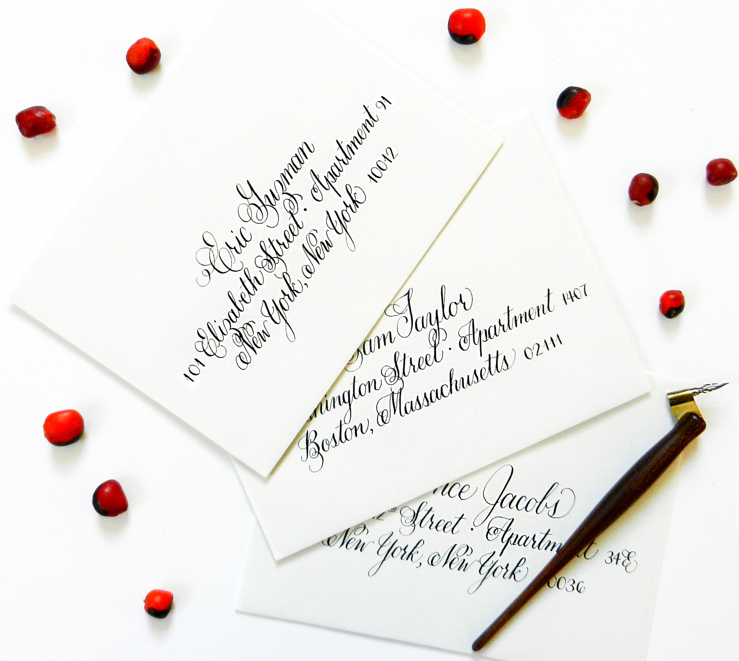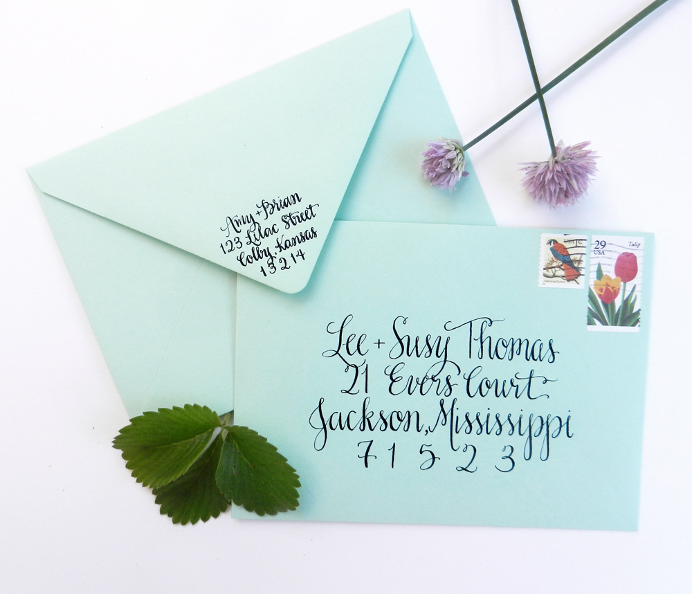 Now that we are in 2016, my calligraphy hardly resembles the first envelope photo! I found the nib of my dreams (the Brause EF66) and a fantastic holder; but most importantly, I had put in plenty of hours of practice. In the Kaitlin Style calligraphy below, you’ll notice that the upstrokes are very thin, while the downstrokes are nice and thick. Thanks to practice, the calligraphy looks confident and polished!